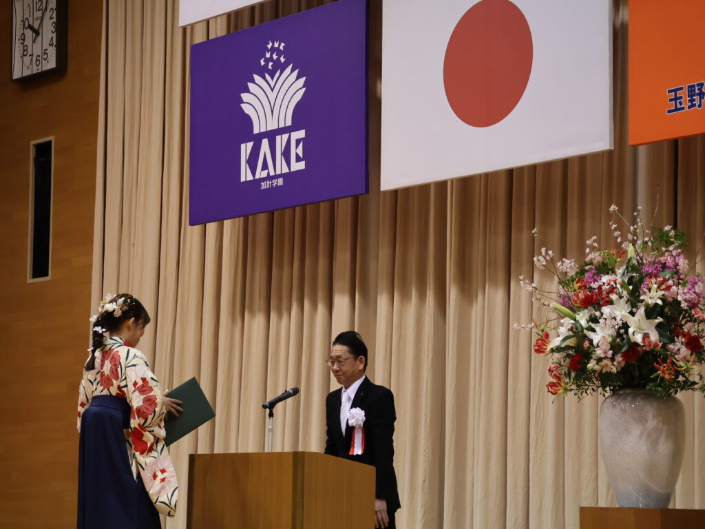 式典の冒頭、北山順崇校長より卒業生一人ひとりに卒業証書が授与されました。校長は式辞の中で、精神科医エリック・バーンの「他人と過去は変えられないが、自分と未来は変えられる」という言葉を引用。