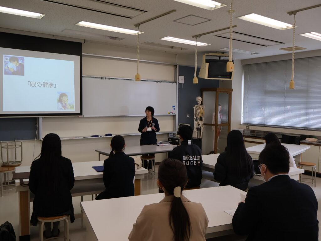 - 保健看護学科:「眼の健康について」 保健師・看護師の視点から、日常的な健康管理の重要性を学びました。一つのテーマで保健師・看護師それぞれの目線で授業体験できるのは本校ならではです。