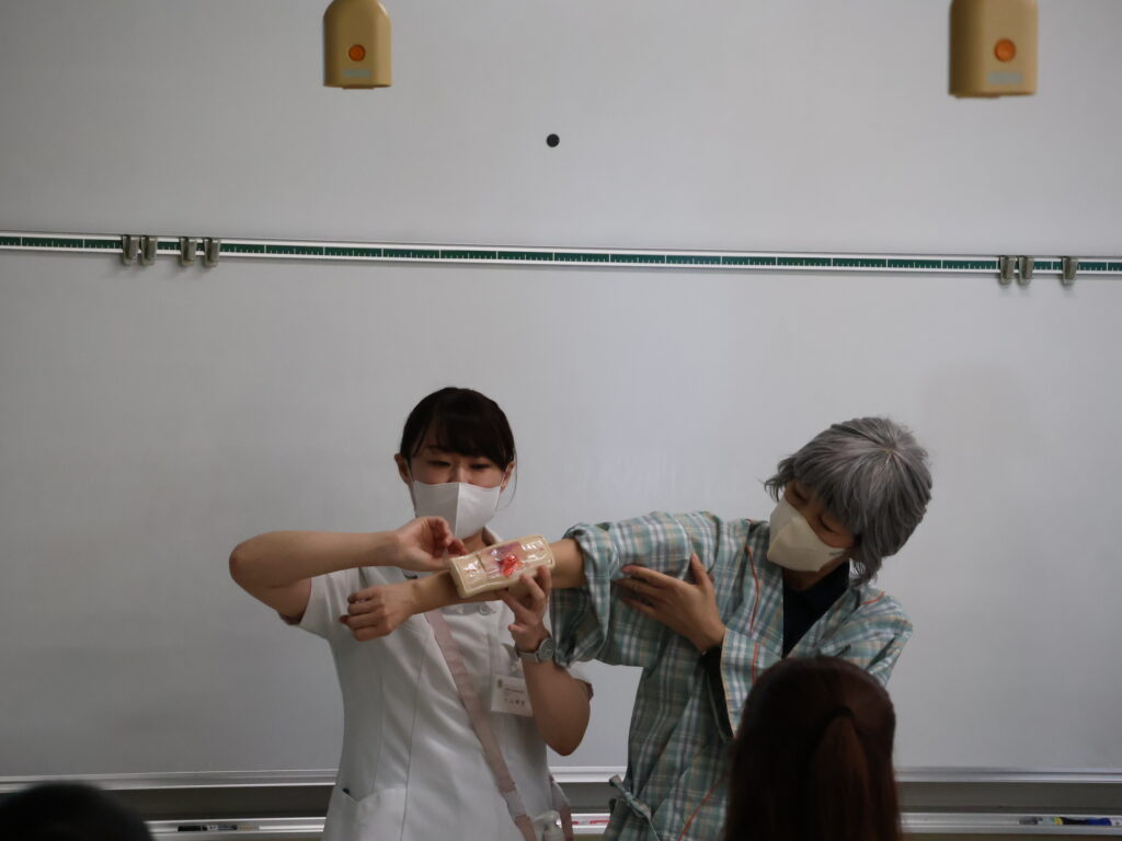 講座の前半では、日常生活で遭遇する「傷」の種類や、適切な手当ての方法について基礎から詳しく学びました 。参加者は、スライドを使った分かりやすい講義を通じて、傷の治癒過程や正しい処置の重要性について理解を深めました。