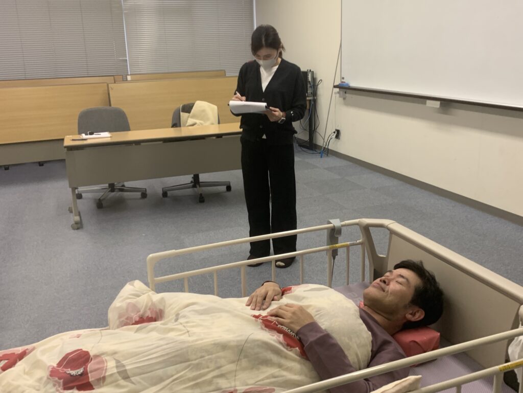 この試験では、患者役への丁寧な問診に加え、例えば「安全かつ適切な移乗介助(車椅子への移動)」や、麻痺などで手が使いにくい方への機能的な評価といった、専門技能がチェックされます。